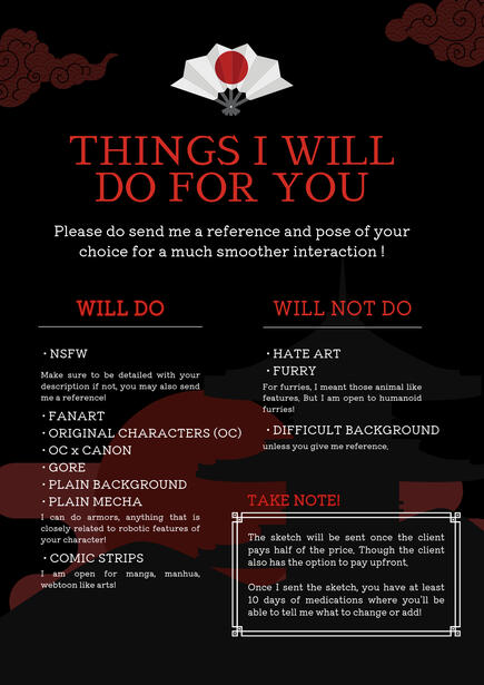 ( Payments are done through Paypal and Gcash. )• You will be receiving a ROUGH SKETCH asking for any modifications 0-10 days after the payment was received.• I'm a communicative artist as i make sure you don't feel like your work being abandoned it is favourable to stay in contact while i work on it.• The commissioner is allowed to use a copyrighted artwork for personal use ONLY. And claim the rights of the character but NOT the drawing itself. As well as the art promote to themselves, with proper credit given to the artist.• I DO NOT apply modifications after the commission is finish otherwise it would cost extra. ( you don't want that do you?)!! REFUNDS ARE STRICTLY PROHIBITED !!